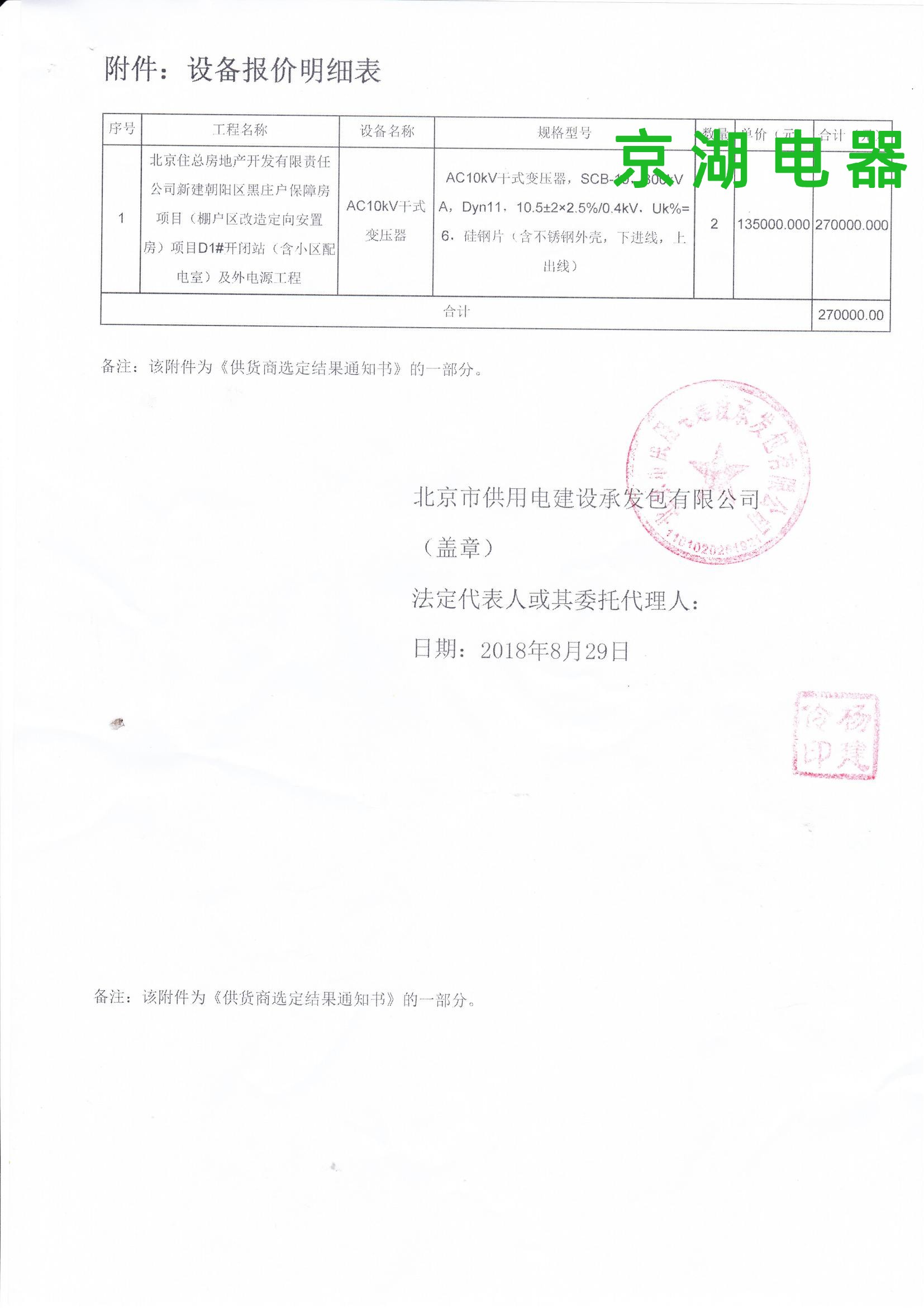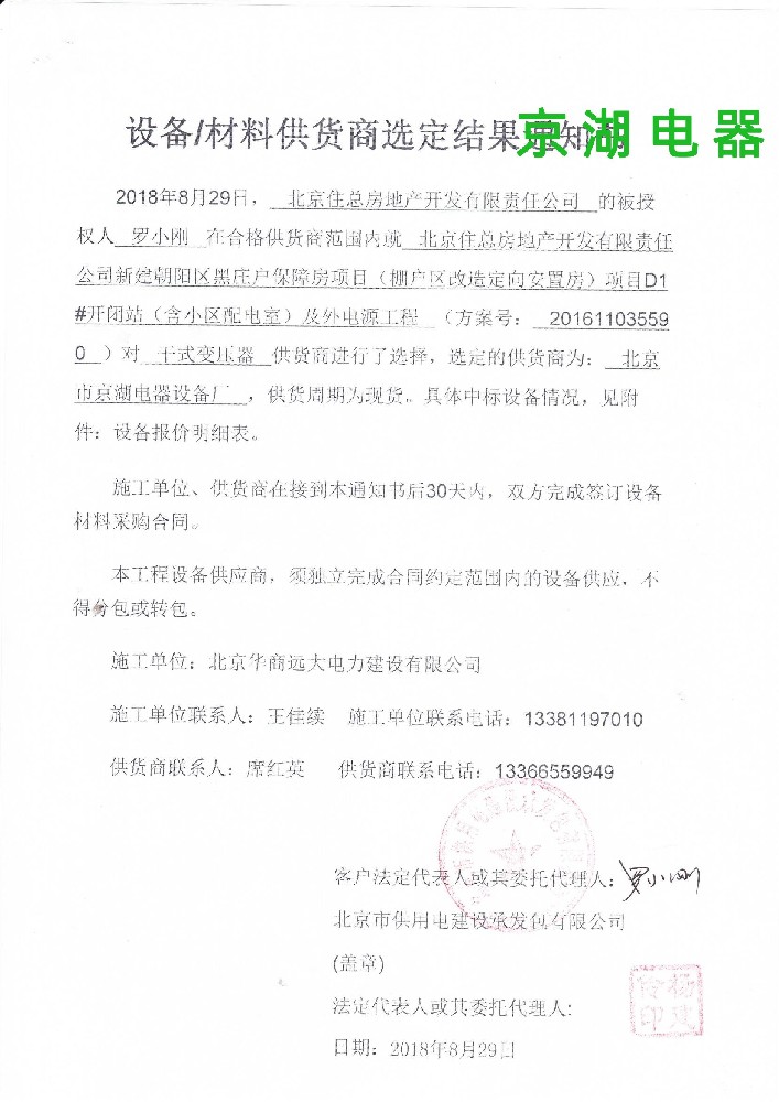 北京住總房地產開發有限責任公司 供貨商選定結果通知書