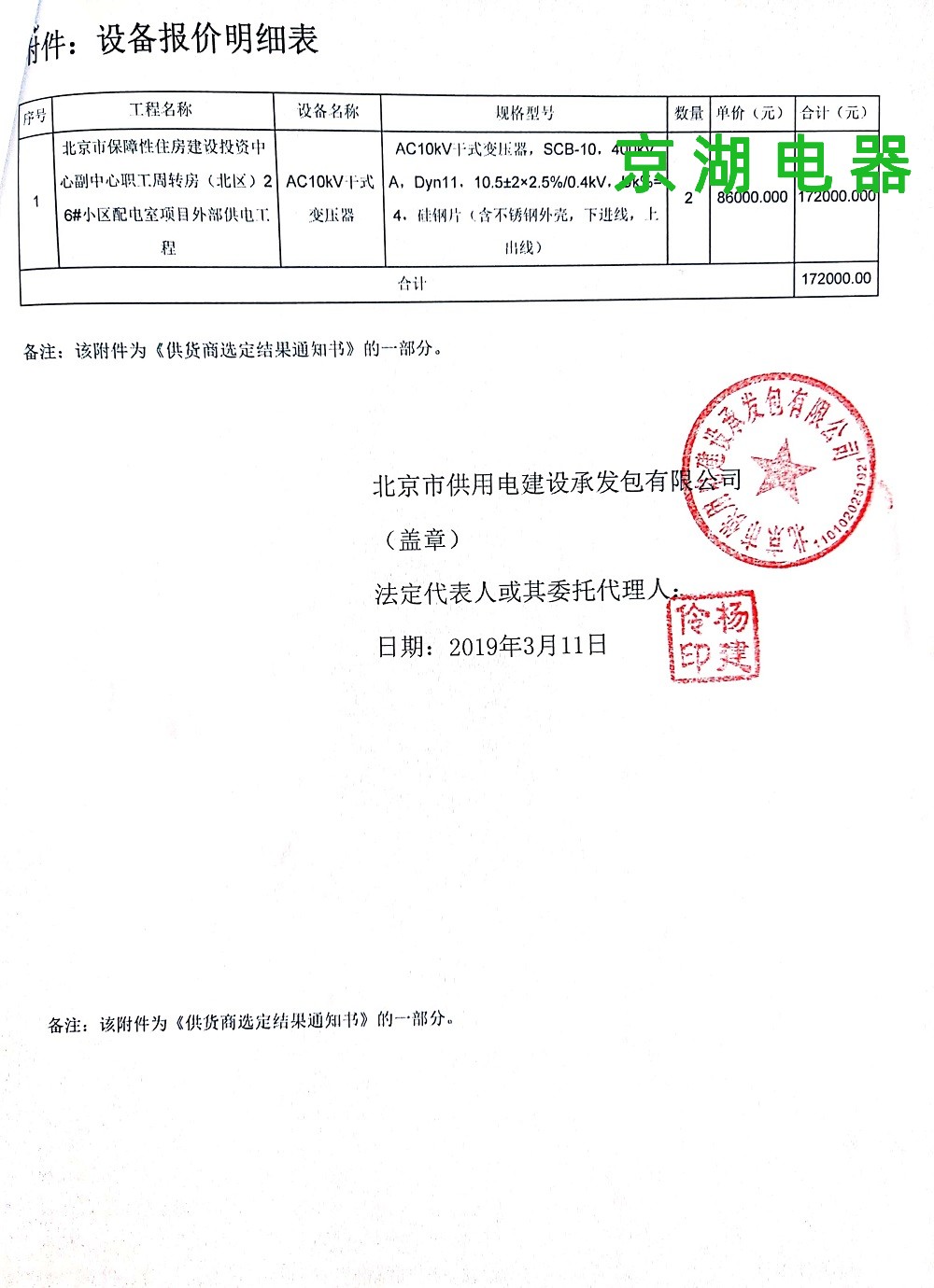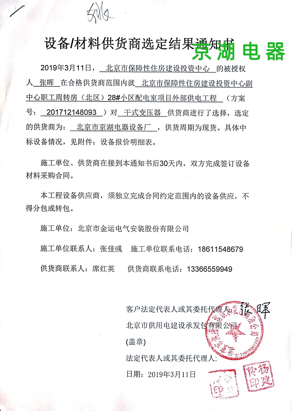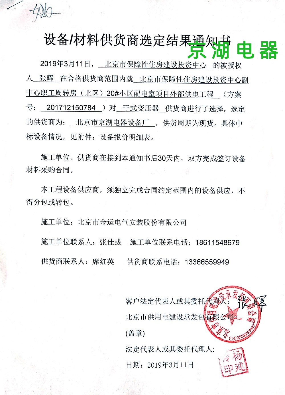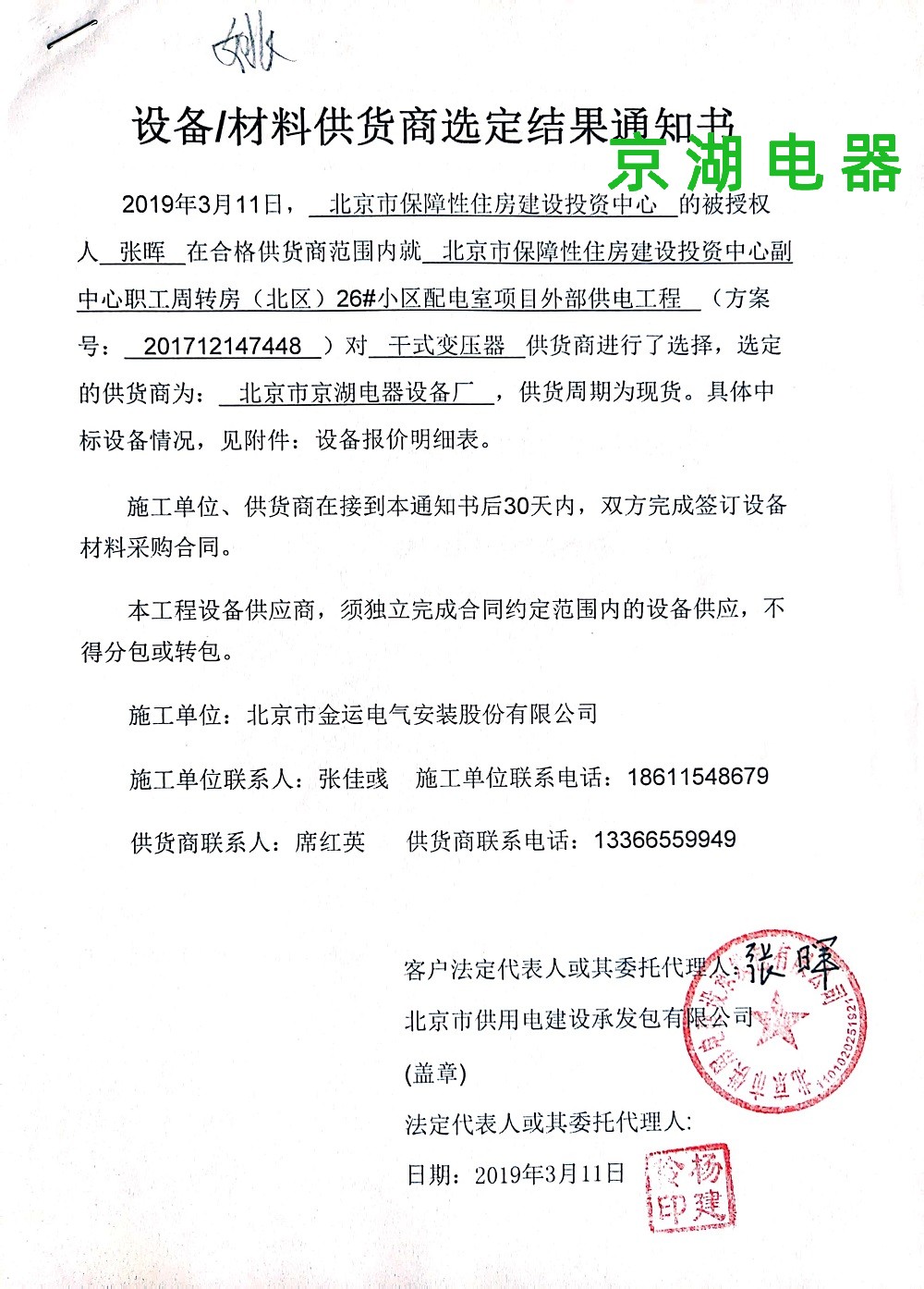 北京市保障性住房建設投資中心 供應商選定結果通知書 2019年3月11日
